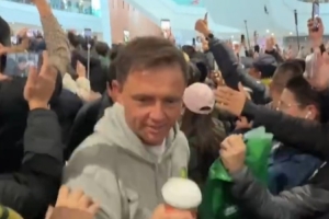 今日国安队搭乘航班返回北京,众多国安球迷前来接机,现场还唱响了国安队歌《国安永远争第一》。