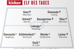 体育资讯12月8日讯 德国媒体《踢球者》评出了德甲第13轮最佳阵容,凯恩、奥利塞、莱默尔、施洛特贝克在列。