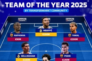 体育资讯12月8日讯 德转列出经投票选出的2025年度最佳阵,姆巴佩、亚马尔、贝林厄姆、佩德里在列。