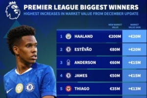 体育资讯12月9日讯 德转更新英超球员身价,哈兰德、埃斯特旺身价均+2000万欧,为本次身价上涨最多的英超球员。