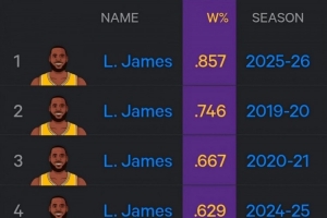 本赛季詹姆斯出战时6胜1负,86.7%的胜率暂列湖人单赛季生涯新高。