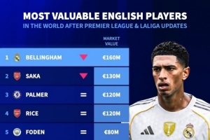 体育资讯12月12日讯 德国转会市场更新了英超、西甲球员的身价,并列出英格兰球员身价排名,贝林厄姆1.6亿欧居首。