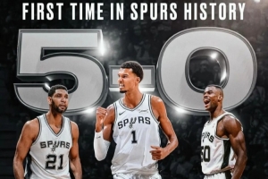 很难想象,在马刺辉煌的球队历史上,竟从未有过5连胜开局,而那个夜晚,年仅21岁的文班亚马,用27分、18个篮板、6次助攻和5次封盖的华丽数据,率队107-101力克热火,将战绩改写为5胜0负,就此书写新的历史。