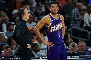 上半场比赛,复出的布克进攻端投篮手感还需要调整,罚球也丢了两个,他出战13分钟,7中4,三分2中0,罚球4中2拿到10分1篮板2助攻1抢断,正负值-6。