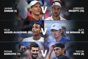 1/4决赛中,德约科维奇将对阵弗里茨,辛纳对阵穆塞蒂,阿尔卡拉斯对阵莱赫卡。