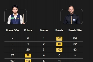 斯诺克球员锦标赛16进8轮次:希金斯6-1淘汰罗伯逊,晋级8强