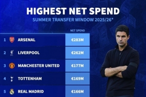 今夏俱乐部转会净支出排名: