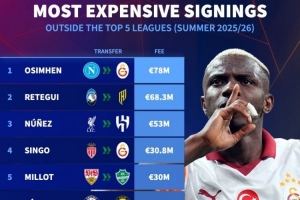 体育资讯9月4日讯 德国转会市场列出了今夏五大联赛之外球队的最贵引援排名,奥斯梅恩居首,雷特吉次席。