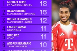 体育资讯12月31日讯 数据网站Squawka盘点了2025年五大联赛助攻榜,其中拜仁球员奥利塞居首,具体如下: