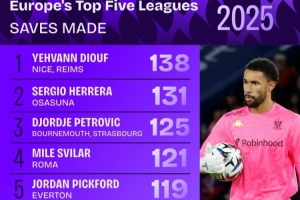 体育资讯1月1日讯 Squawka列2025年五大联赛门将扑救次数榜,尼斯门将叶赫万·迪乌夫以138次居首。