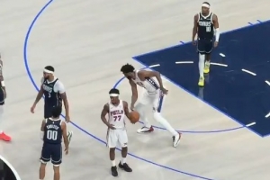 GIF-恩比德死球被砸脑袋 然后踉跄着模仿老太太摔跤