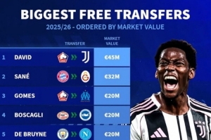 体育资讯9月4日讯 《转会市场》统计了今夏自由身转会球员的身价情况,戴维力压萨内居首。