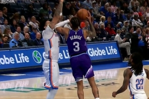 GIF-基昂特·乔治突破飞身放篮打成2+1 雷霆挑战成功改判进攻犯规