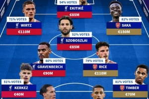 德转球迷票选阿森纳+利物浦合体最佳阵(身价及得票率):欧元