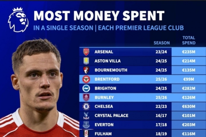 体育资讯08月21日讯 德转统计了英超球队的单赛季引援支出纪录。