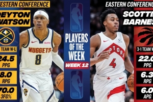 体育资讯1月13日讯 今日NBA官方宣布,掘金队的沃特森和猛龙球星巴恩斯分获西部和东部周最佳球员。