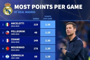 体育资讯1月13日讯 皇马官方宣布主帅阿隆索下课,德国转会市场统计了皇马主帅的场均积分,阿隆索2.24分排名第7位。