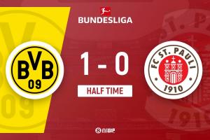 体育资讯1月17日讯 北京时间1月17日22:30,德甲第18轮,多特蒙德坐镇伊杜纳信号公园球场迎战圣保利。上半场,布兰特射门被瓦尔门线解围,施洛特贝克、阿德耶米犯规染黄,补时阶段,布兰特破门打破场上僵局。半场战罢,多特蒙德暂1-0圣保利!