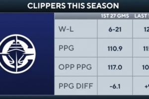 快船前27场 战绩6胜21负 场均得分110.9 场均失分117.0 场均净胜分-6.1