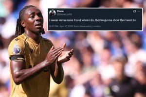 太阳报表示,16岁的埃泽当时刚刚被米尔沃尔解约,在2015年4月他发布了这条社媒:我发誓我一定会成功的,等我成功了,他们肯定会把这条推文找出来的,哈哈。