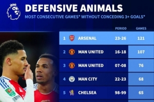 体育资讯1月26日讯 曼联在本轮英超3-2绝杀阿森纳,也终结了对手各项赛事连续121场都丢球数不超过2球的纪录。
