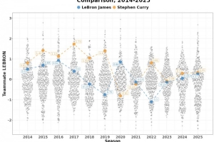 体育资讯9月12日讯 近日,数据媒体BBall-Index晒图比较了2014-2025年期间詹姆斯和库里的队友强度。