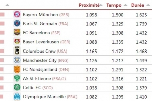 排名第一的拜仁获得了100分的综合评分(即其他球队以拜仁的100分作为综合指标),巴黎、巴萨作为二、三名分获98.9和98.6分。