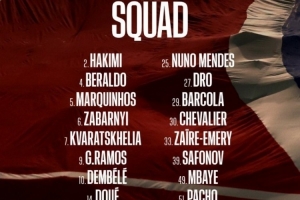 前锋:7-克瓦拉茨赫利亚、9-贡萨洛·拉莫斯、10-登贝莱、14-杜埃、29-巴尔科拉、49-姆巴耶