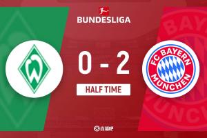 第25分钟,不莱梅后场出球失误被断,凯恩弧顶处得球远射打进球门死角,拜仁慕尼黑2-0不莱梅。↓