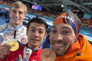 米兰冬奥会速度滑冰男子1500米比赛,宁忠岩刷新奥运纪录夺金,为中国代表团拿下第三金。宁忠岩的领奖台自拍照可以看到,他的眼角也挂着激动的泪水。