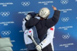 场边央视镜头记录到,在王心迪完成完美一跳后,徐梦桃跑过来送给爱人一个大大的拥抱!