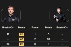 体育资讯9月18日讯 2025斯诺克英格兰公开赛32进16轮次,赵心童对阵杰克-利索夫斯基,全场比赛利索夫斯基打出三杆50+,赵心童打出一杆50+,最终赵心童1-4不敌利索夫斯基,无缘16强。