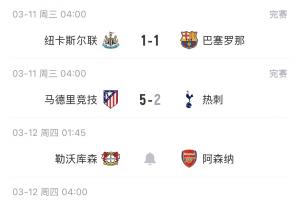 体育资讯03月11日讯 欧冠1/8决赛首回合踢完4场比赛,英超3队出战一场未胜。