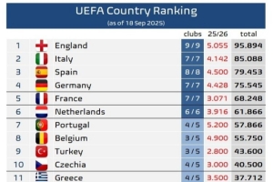 体育资讯9月19日讯 欧冠联赛阶段首轮已经完赛,相关机构也统计了本赛季的欧战积分情况,并更新了欧足联旗下各协会的积分排名。英格兰依然独自领跑,而意大利第二的位置仍暂时牢固,但领先优势有略微缩小。