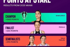 WTA迈阿密站保分情况:萨巴伦卡1000分,郑钦文、斯瓦泰克215分