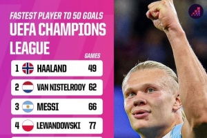 据Opta数据统计,欧冠50球最快达成球员场次排名: