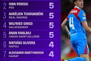 5次:加拉格尔(马竞)、佩里西奇(埃因霍温)、琼阿梅尼(皇马)、辛格(加拉塔萨雷)、阿南-哈莱利(圣吉罗斯)