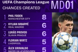 体育资讯9月19日讯 欧冠首轮已经完赛,数据机构squakwa也统计了首轮的创造机会和创造重大机会情况。福登以8次创造机会居首。