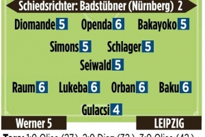 体育资讯8月23日讯 德甲首轮比赛,拜仁主场6-0击败莱比锡,《图片报》对两队球员和教练进行了评分,凯恩、迪亚斯、格纳布里、奥利塞1分最高。