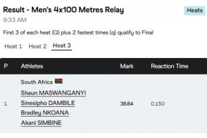 体育资讯09月21日讯 2025年东京田径世锦赛,男子4x100米接力预赛重赛,南非队跑出38秒64,未能达到38秒34的晋级线,无缘今晚进行的决赛。