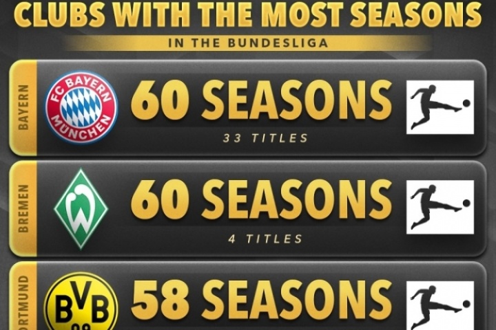 2、不莱梅,60个赛季,4冠