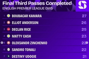 英超第5轮进攻三区完成传球排行: