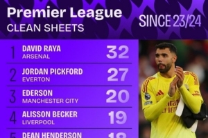 体育资讯9月25日讯 自2023-24赛季以来的英超门将零封榜出炉,阿森纳门将拉亚以32场零封第一,皮克福德、埃德森分列二三。