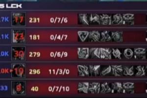 决胜局Viper卡莎拿下11/3/0数据,拿下全队所有人头;其余四位队友全部人头挂零。