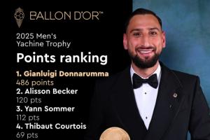 体育资讯09月27日讯 2025年雅辛奖排名详情公布,荣获该奖项的意大利门将多纳鲁马以486分断层领先,第2名阿利森获得120分,第3名索默获得112分。