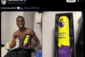 本场比赛热刺球员萨尔表现不俗,赛后他也当选英超官方评选出的本场最佳球员。球员赛后也在个人社媒晒出与奖杯的合照。