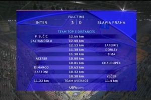 本场比赛国米方面跑动距离最多的是苏西奇的12.66km,其次为恰尔汗奥卢12.40km,之后分别是阿切尔比10.88km,迪马尔科10.63km,巴斯托尼10.32km。