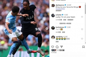 此役热刺边卫斯宾塞踢满全场,帮助球队取胜,赛后他在社交媒体上晒出比赛照片,并配文:“让你们最喜欢的边锋放马过来!”展现自己不惧对抗的自信。