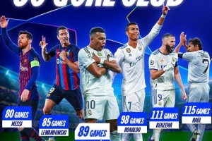 欧冠官方也盘点了历史上打进欧冠60球最快用时场次榜,具体如下: