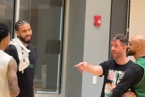 训练间隙,塔图姆与怀特和新援安芬尼-西蒙斯互相聊天。